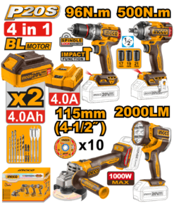 Combo inalámbrico de alto rendimiento diseñado para profesionales que requieren herramientas potentes, duraderas y sin cables para tareas de perforación, atornillado, corte y trabajo en zonas con poca luz. Equipado con un taladro percutor brushless de 96NM, una llave de impacto de 500NM, un esmeril angular de 115 mm y una linterna LED de 2000 lúmenes, este set garantiza precisión y productividad en obra, taller o proyectos de bricolaje. Incluye dos baterías de 4AH, cargador rápido y un completo kit de accesorios.