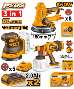 Kit de alto rendimiento ideal para tareas de acabado, lijado y pintura tanto en espacios residenciales como profesionales. Incluye una lijadora de yeso de 850W con luz integrada para trabajos precisos en muros y techos, una lijadora roto orbital inalámbrica perfecta para acabados finos, y una pistola pulverizadora de alto caudal para aplicar pintura de forma uniforme. Todo el equipo está potenciado por dos baterías de 2AH y un cargador, asegurando movilidad y eficiencia en cualquier entorno de trabajo.
