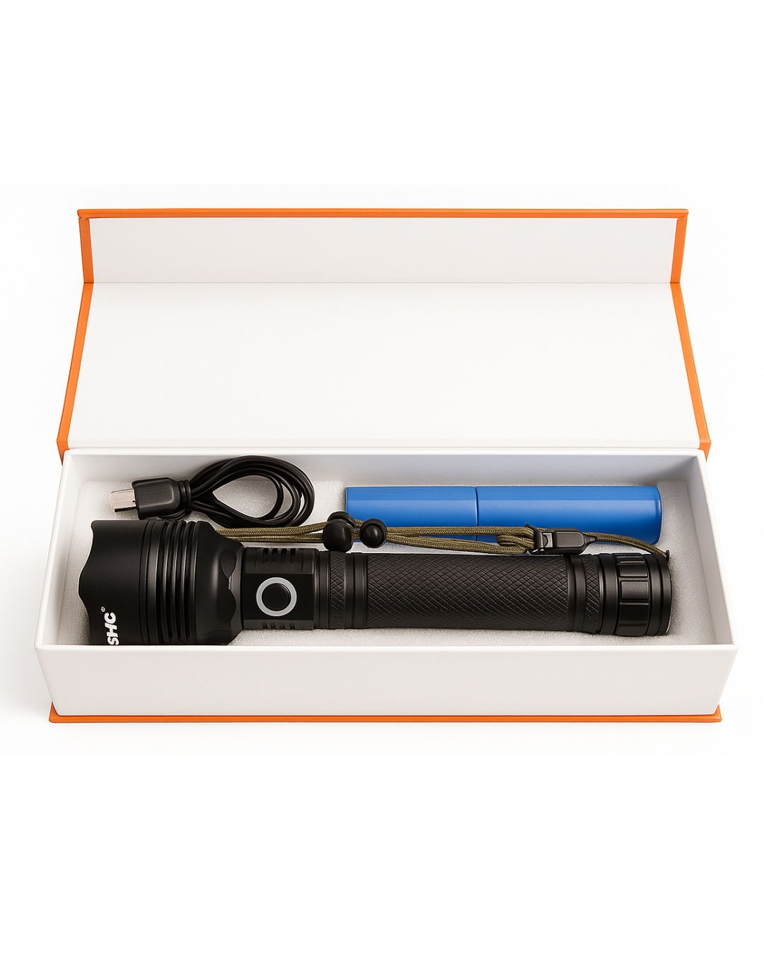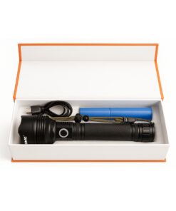 Gracias a sus dos baterías recargables 26650 (6 000 mAh), esta linterna ofrece excelente autonomía. Su diseño incluye correa de mano, adaptador para pilas AAA y cable USB para una experiencia lista para usar desde el primer momento.
