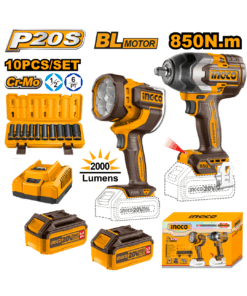 Este completo kit combo a batería de 20V es la solución ideal para profesionales y aficionados que exigen potencia, versatilidad y precisión en sus trabajos. Incluye una llave de impacto inalámbrica con motor sin carbones y accionamiento cuadrado de ½″, que ofrece variadas velocidades sin carga y de impacto para adaptarse a diferentes necesidades, alcanzando pares de apriete de 850 NM y 1000 NM. Complementando la herramienta, la lámpara de trabajo inalámbrica de 24 W proporciona 2000 lúmenes (±10) y cuenta con una empuñadura ergonómica con softgrip, además de una cabeza LED giratoria hasta 120°.