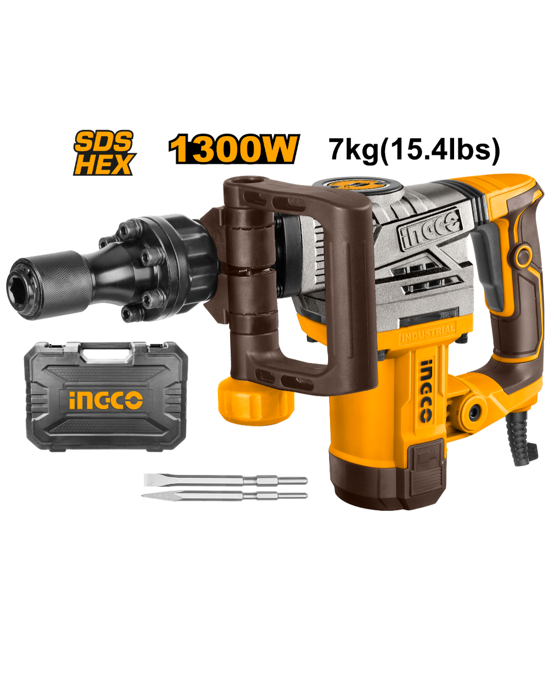 Herramienta robusta diseñada para trabajos intensos de demolición y perforación. Posee un motor de 1300W que opera con un voltaje de 220-240V a 50/60Hz. Este martillo tiene una tasa de impacto de 3800 golpes por minuto (bmp) y una fuerza de impacto de 20J, lo que asegura una potente eficiencia en diversas aplicaciones de construcción y renovación. Entre sus características destacan su sistema antivibración, que reduce la fatiga del usuario durante el uso prolongado, y su sistema de portabrocas HEX de 17 mm, que permite un cambio rápido y seguro de herramientas. El martillo incluye dos cinceles de 17 x 280 mm y se presenta en una maleta BMC para facilitar su transporte y almacenamiento. Su peso total es de 6-7 kg, lo que lo hace relativamente manejable para una herramienta de su categoría.