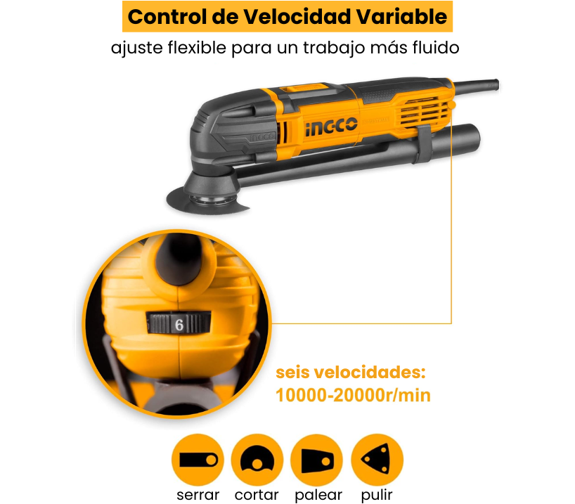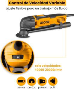 Herramienta versátil y potente ideal para una variedad de tareas de bricolaje y renovación. Con un motor de 300W y una velocidad sin carga de 10,000-20,000 rpm, es capaz de cortar, lijar y raspar con precisión. Incluye varios accesorios como una cuchilla de sierra segmentada, una base de lijado, y papeles de lija. Es una opción práctica para quienes buscan una herramienta multifuncional y eficiente.