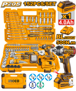 Este kit de 152 piezas es una solución integral para profesionales y entusiastas del bricolaje, ya que combina una potente llave de impacto inalámbrica de 20V con un par de apriete de 500 NM (y 650 NM para aflojar tuercas), junto con una batería de 4AH y un cargador. Además, el set incluye una amplia gama de accesorios meticulosamente seleccionados —entre casquillos, llaves, barras de extensión, adaptadores, bits y destornilladores en medidas de ¼, ½ y 3/8—, todo organizado en una práctica valija, lo que garantiza versatilidad, comodidad y eficiencia para realizar trabajos mecánicos y de mantenimiento de alta exigencia.