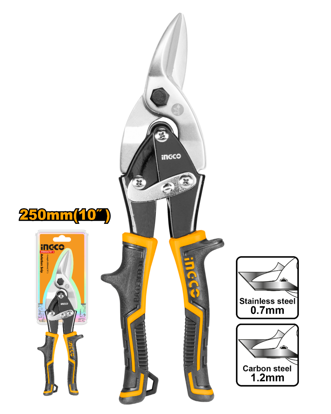 Tijera de aviación profesional de 10″ (250 mm), diseñada para cortes laterales en láminas de acero y acero inoxidable. Su diseño ergonómico con mangos recubiertos en goma suave asegura un agarre cómodo y antideslizante, facilitando el trabajo prolongado con mayor precisión y seguridad. Ideal para chapistas, instaladores y trabajos de corte en metal.